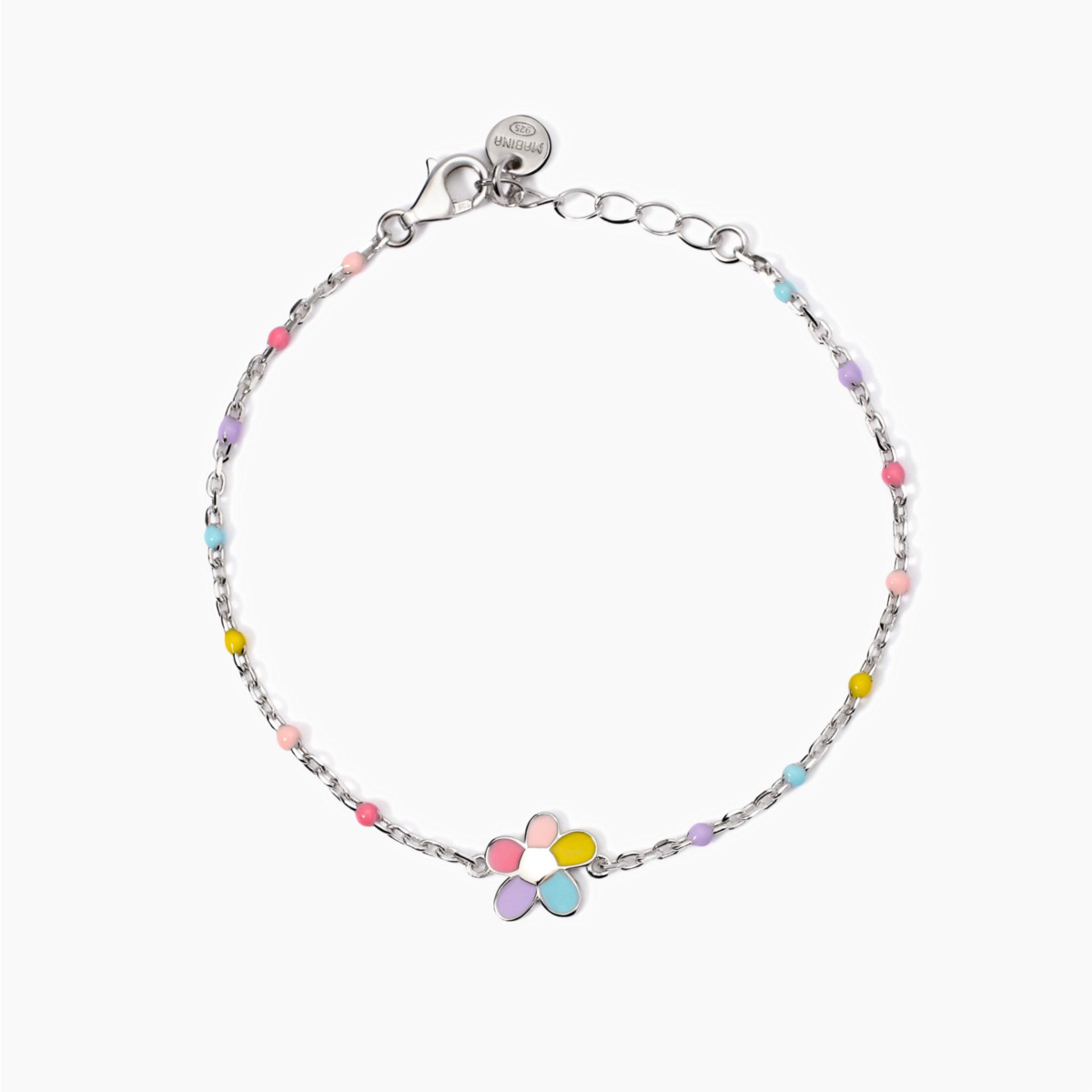 Bracciale bimba mabina, 533935, collezione argento junior, in argento rodiato con inserti smaltati, catena forzatina ed elemento centrale smaltato a forma di fiorellino. • Dimensione ciondolo fiore: 8, 5 x 8, 5 mm • Misura regolabile, lunghezza da 14, 5 a 16, 5 cm • Larghezza della catena: 1, 5 mm • Chiusura con moschettone