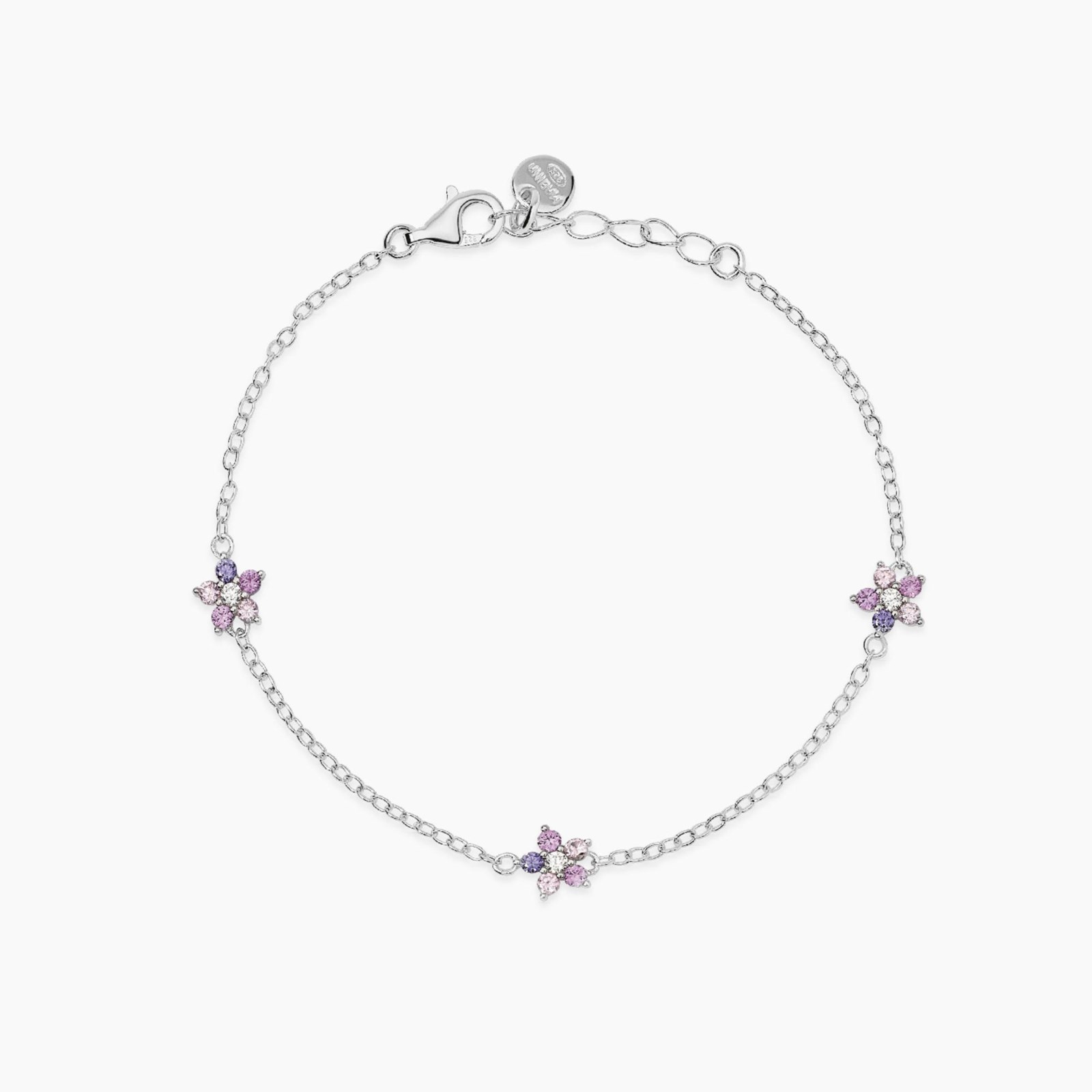 Bracciale bimba mabina, 534127, collezione argento junior, in argento rodiato e fiori in tormaline rosa sintetiche e zirconi multicolor.