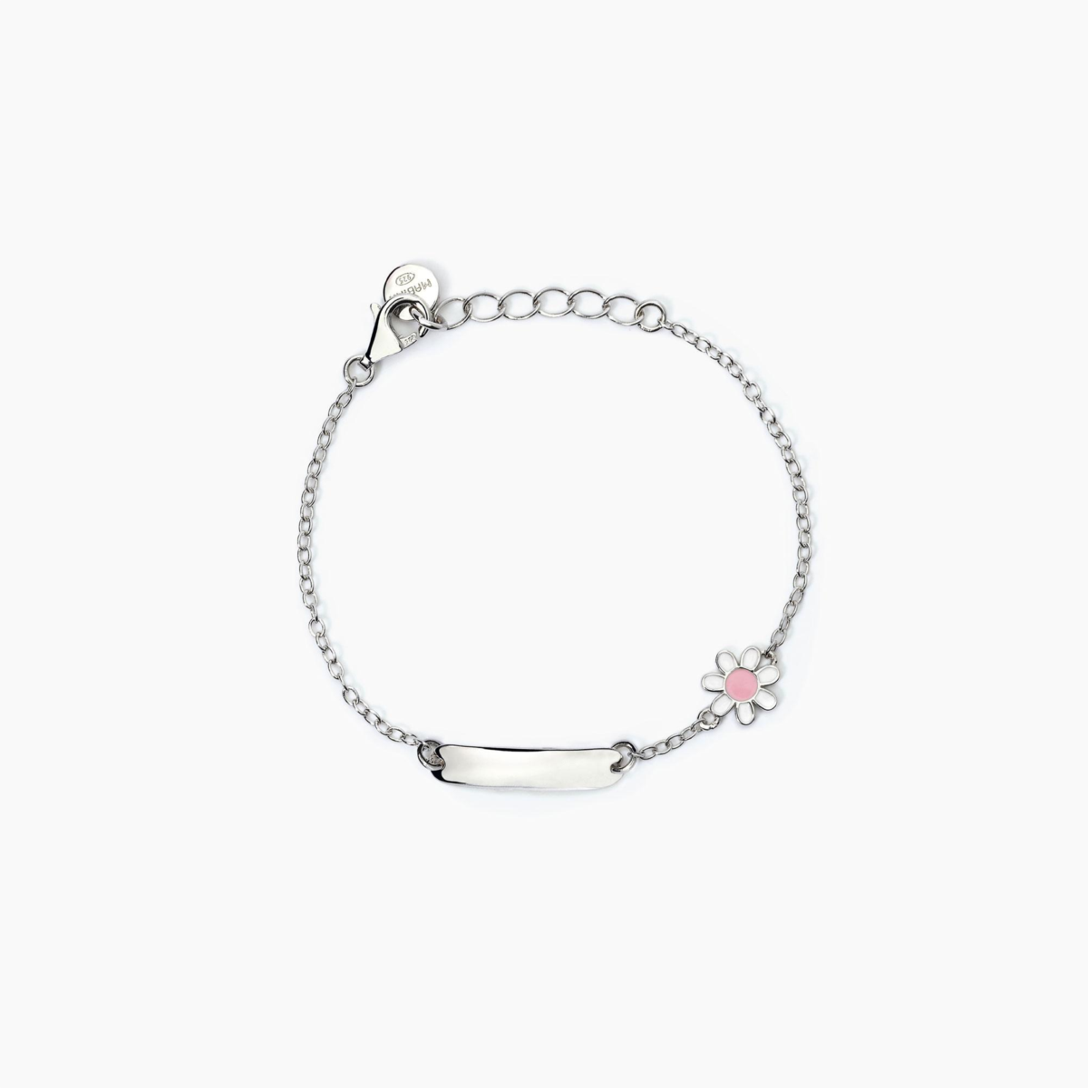 Bracciale bimba mabina, 533797, collezione daisy, regolabile in argento rodiato con catena forzatina, piastra personalizzabile e margherita smaltata.