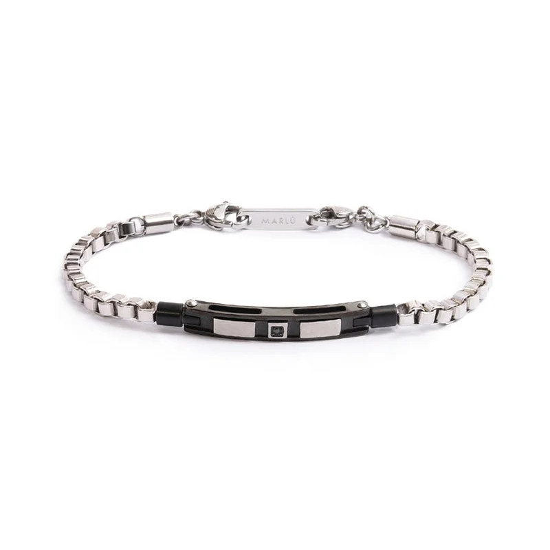 Bracciale uomo marlù, 30BR0022N, collezione icons, in acciaio composto una catena box a maglie quadrate e una targa con elementi in pvd nero e zircone nero al centro.