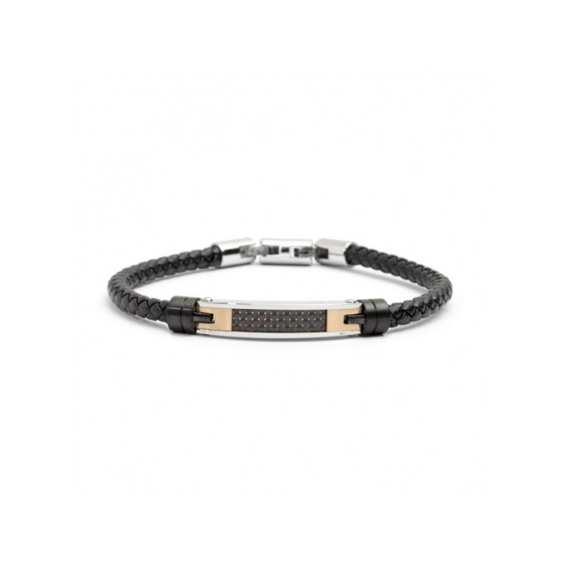 Bracciale uomo marlù, 4BR1811NR, collezione icons, in acciaio pelle targa in acciaio con inserti smalto nero e acciaio rosato con doppia chiusura , 21 cm regolabile