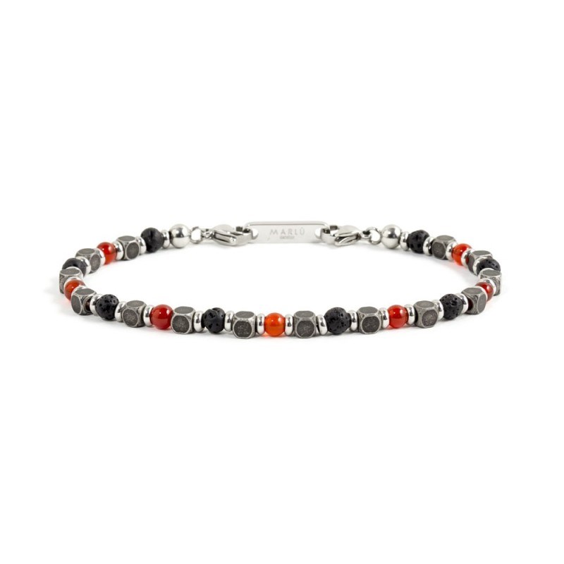 Bracciale uomo marlù, 1BR0012, collezione namastè, Bracciale in acciaio con pietra corniola rossa, pietra lavica, ed elementi in acciaio e acciaio brunito.