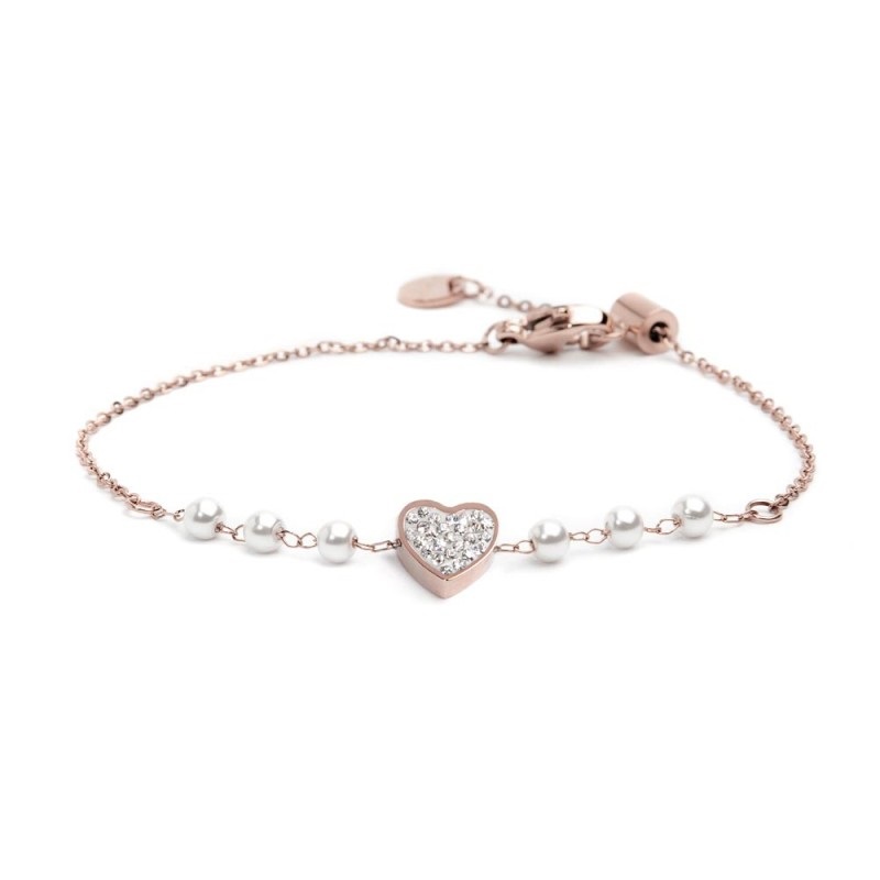 Bracciale donna marlù, 15BR067R-W, collezione nel mio cuore, in acciaio rosato con catena cross e catena con perle.