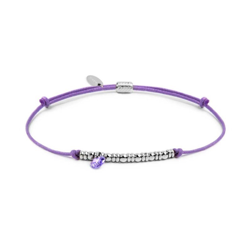 Bracciale donna marlù, 18BR220-L, collezione time to, con cordino colore viola, sfere centrali in acciaio e zircone pendente.