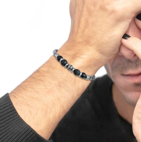 Bracciale uomo marlù, 33BR0029-N, collezione vision, in acciaio con catena box con trama, con sfere di onice nera opaca e sfere in pietra lavica, elemento centrale tondo in acciaio con trama con black oil opaco.