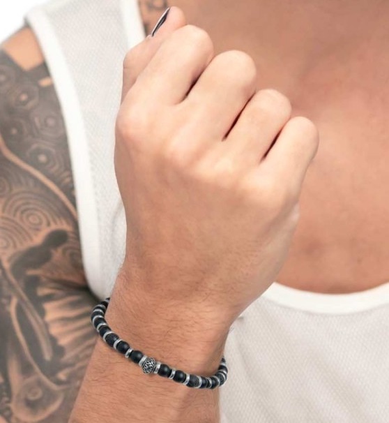Bracciale uomo marlù, 33BR0030-N, collezione vision, e in acciaio con sfere alternate di onice nera, pietra lavica e anellini in acciaio lisci e con trama.
