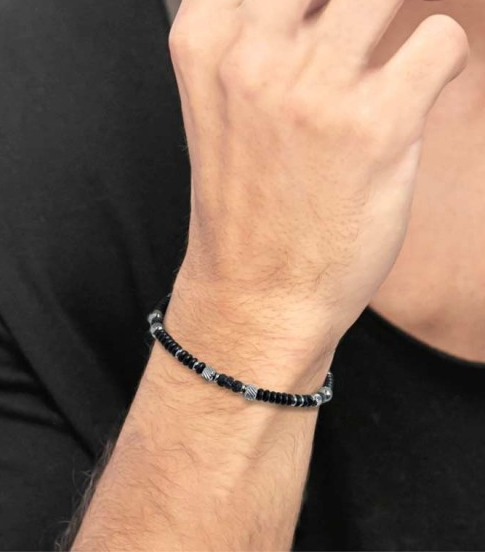 Bracciale uomo marlù, 33BR0033-N, collezione vision, in acciaio con dischetti di onice nera alternati a dischetti in pietra lavica, anellini in acciaio ed elementi in acciaio con trama.