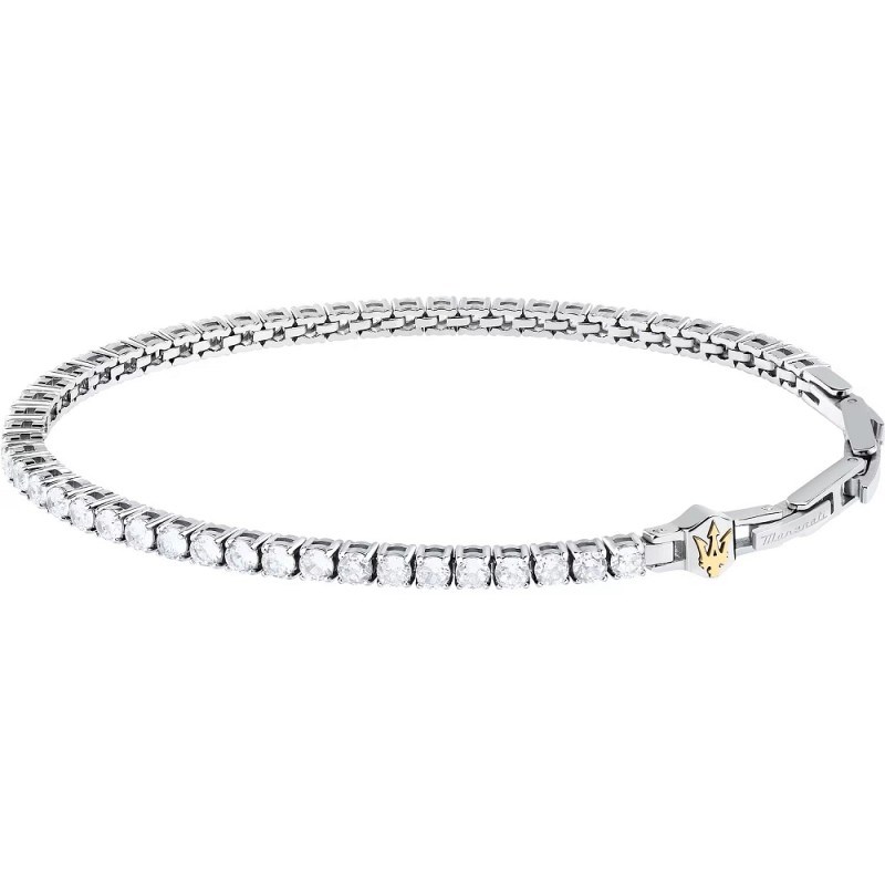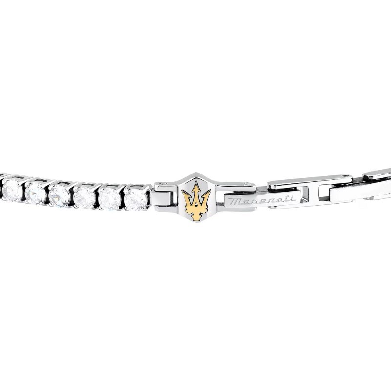 Bracciale uomo maserati, JM425AVC12, collezione tennis, in acciaio anallergico 316L, modello Tennis con zirconi bianchi dal diametro di 3 mm e valorizzato con il caratteristico logo a tridente del brand in PVD gold.