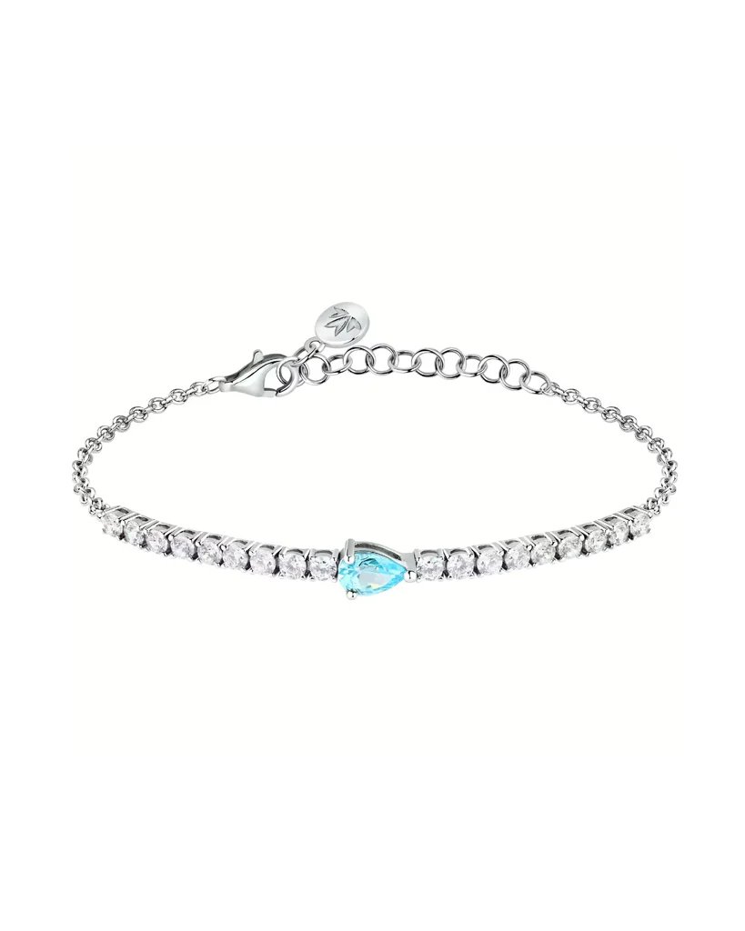 Bracciale donna morellato, SAIW200, collezione tesori, in argento 925‰ rodiato con una sezione centrale impreziosita da zirconi bianchi e da uno azzurro taglio goccia.