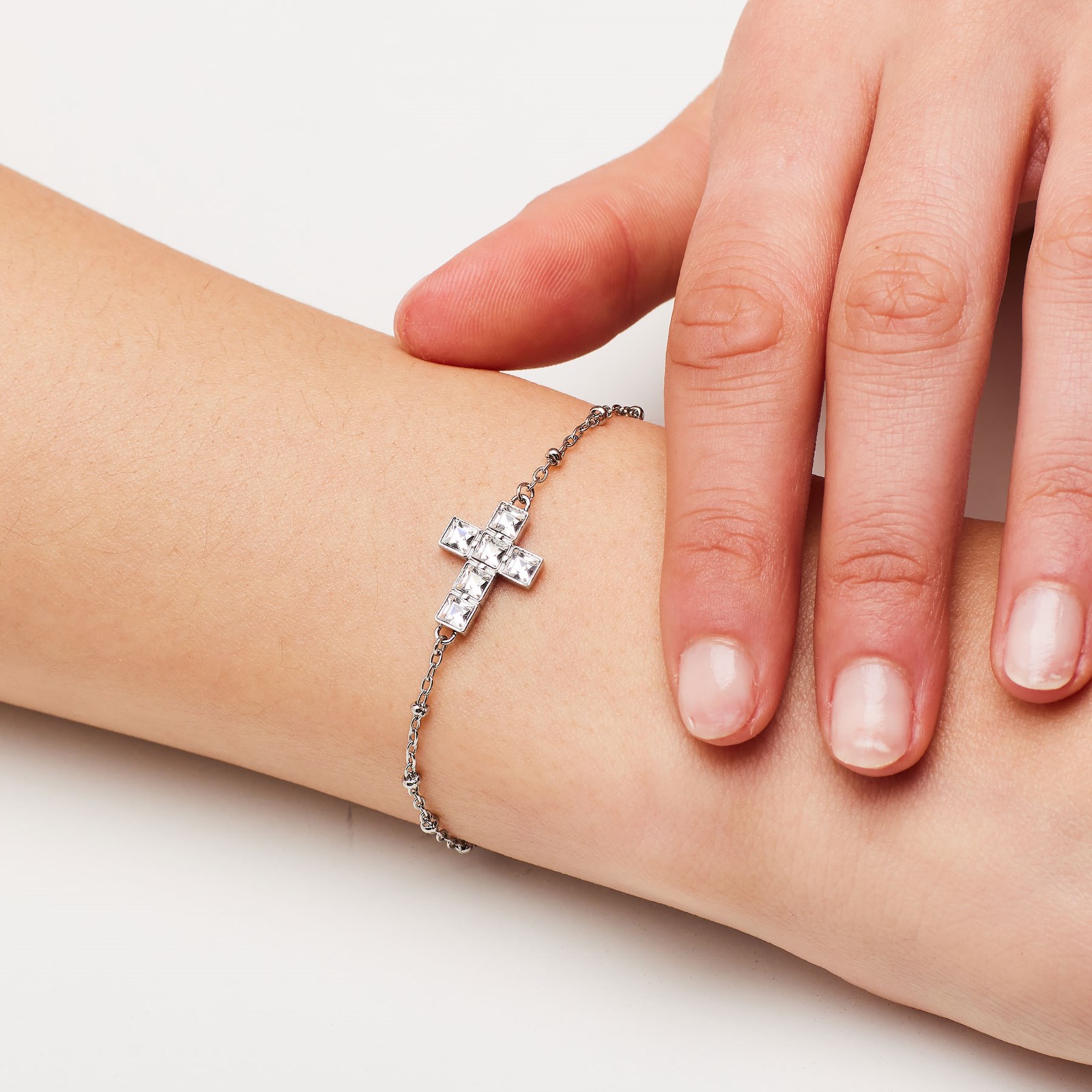 Bracciale donna sagapò, SRD13, collezione arcadia, in acciaio 316L con centrale a forma di croce e cristalli. lunghezza 18, 5cm