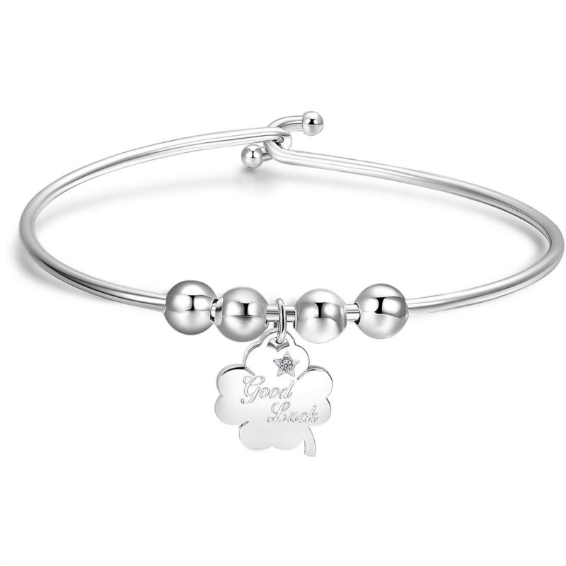 Bracciale donna s'agapò, Sbm61, collezione be my always, in acciaio, ciondolo quadrifoglio con cristallo e scritta:'good luck'