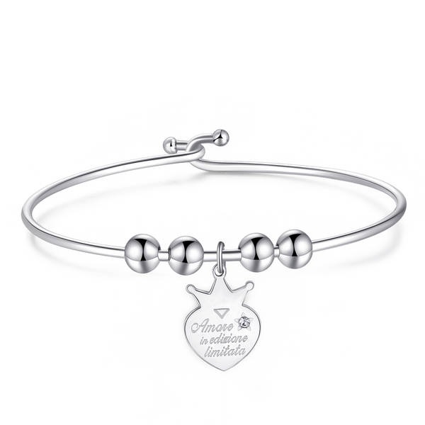 Bracciale donna sagapò, Sbm67, collezione be my always, in acciaio rigido e cristallo, pendente a forma di cuore con incisione “Amore in edizione limitata”, diametro 5, 8cm