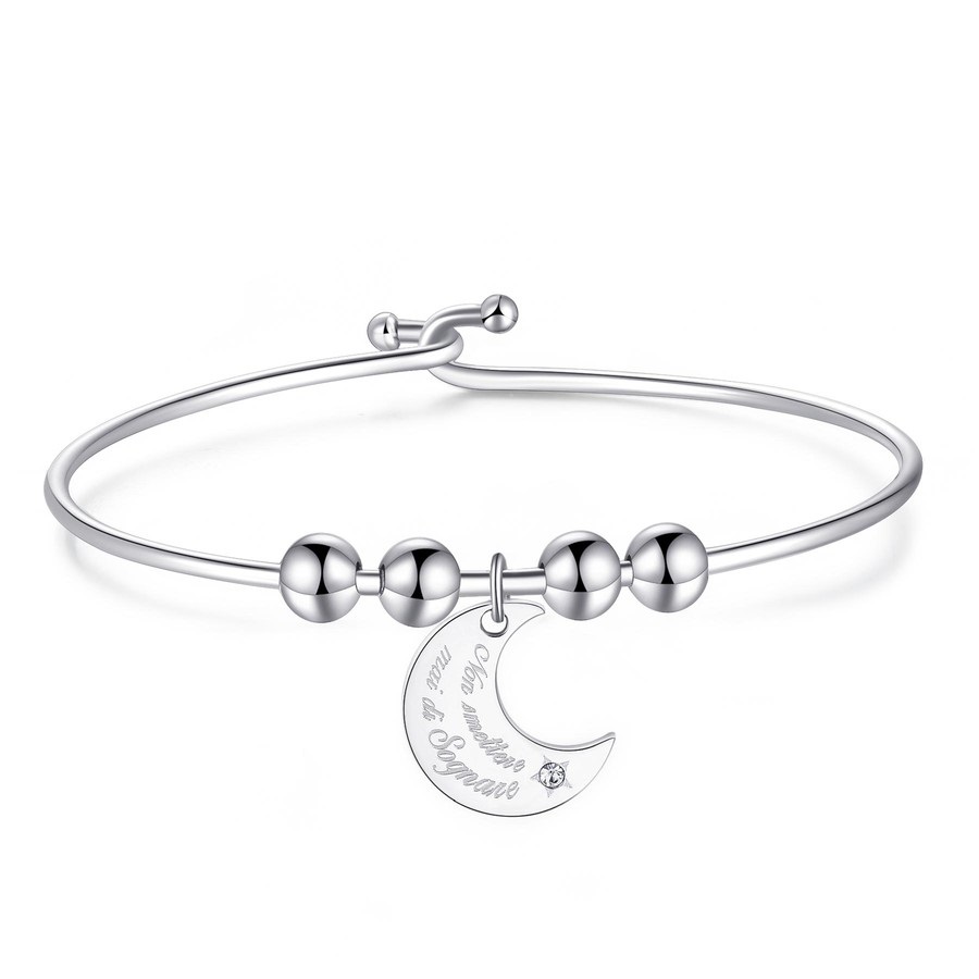 Bracciale donna sagapò, Sbm69, collezione be my always, in acciaio rigido con pendente a forma di luna e cristallo, incisione “Non smettere mai di sognare”, diametro 5, 8cm