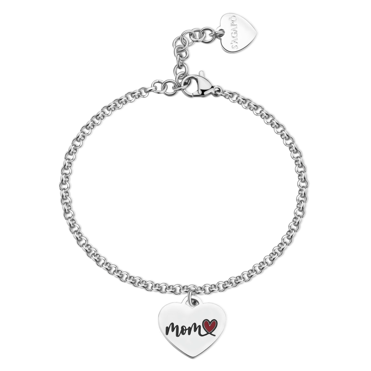 Bracciale donna s'agapo, SBY034, collezione be my family, in acciaio 316L con pendente a forma di cuore con scritta "Mom" in smalto nero e cuore in smalto rosso su fronte e scritta "Tutto l'amore è per te, mamma" in smalto nero su retro, lunghezza 18, 5cm