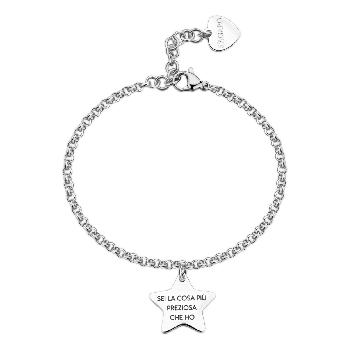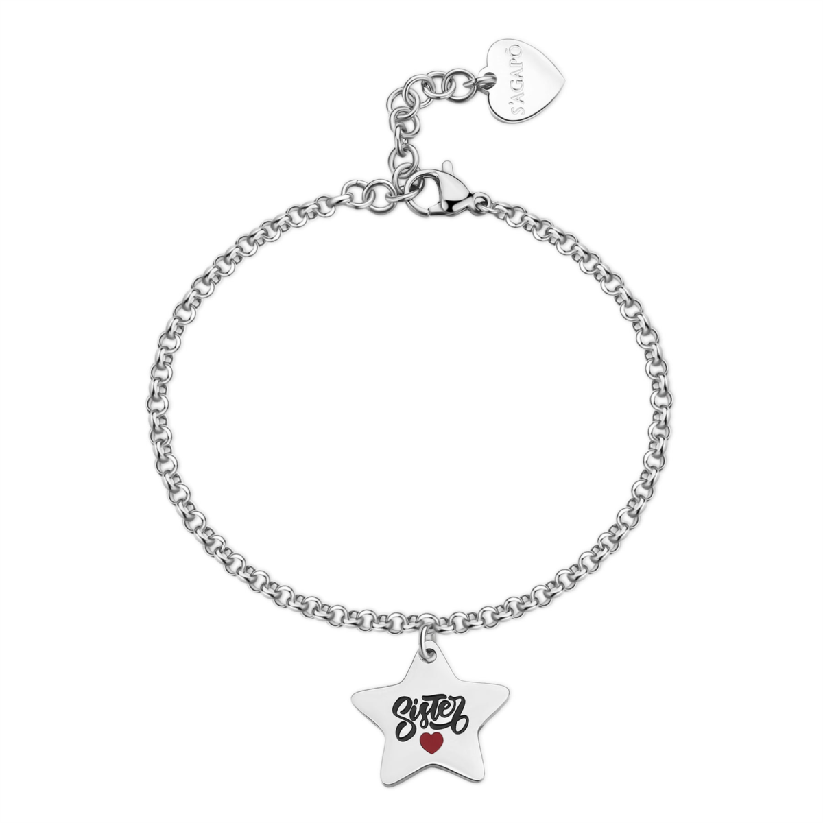Bracciale donna s'agapo, SBY035, collezione be my family, in acciaio 316L con pendente a forma di stella con scritta "Sister" in smalto nero e cuore in smalto rosso su fronte e scritta "Sei la cosa più preziosa che ho" in smalto nero su retro, lunghezza 18, 5cm
