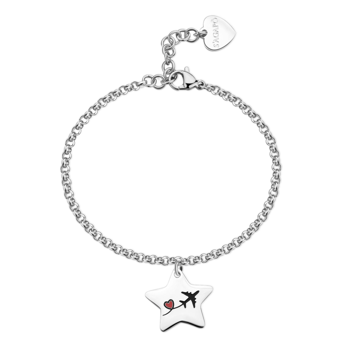 Bracciale donna s'agapo, SBY044, collezione be my family, in acciaio 316L con pendente a forma di stella con aereo in smalto nero e cuore in smalto rosso su fronte e scritta "Non importa dove vai, ma con chi vai" in smalto nero su retro, lunghezza 18, 5cm