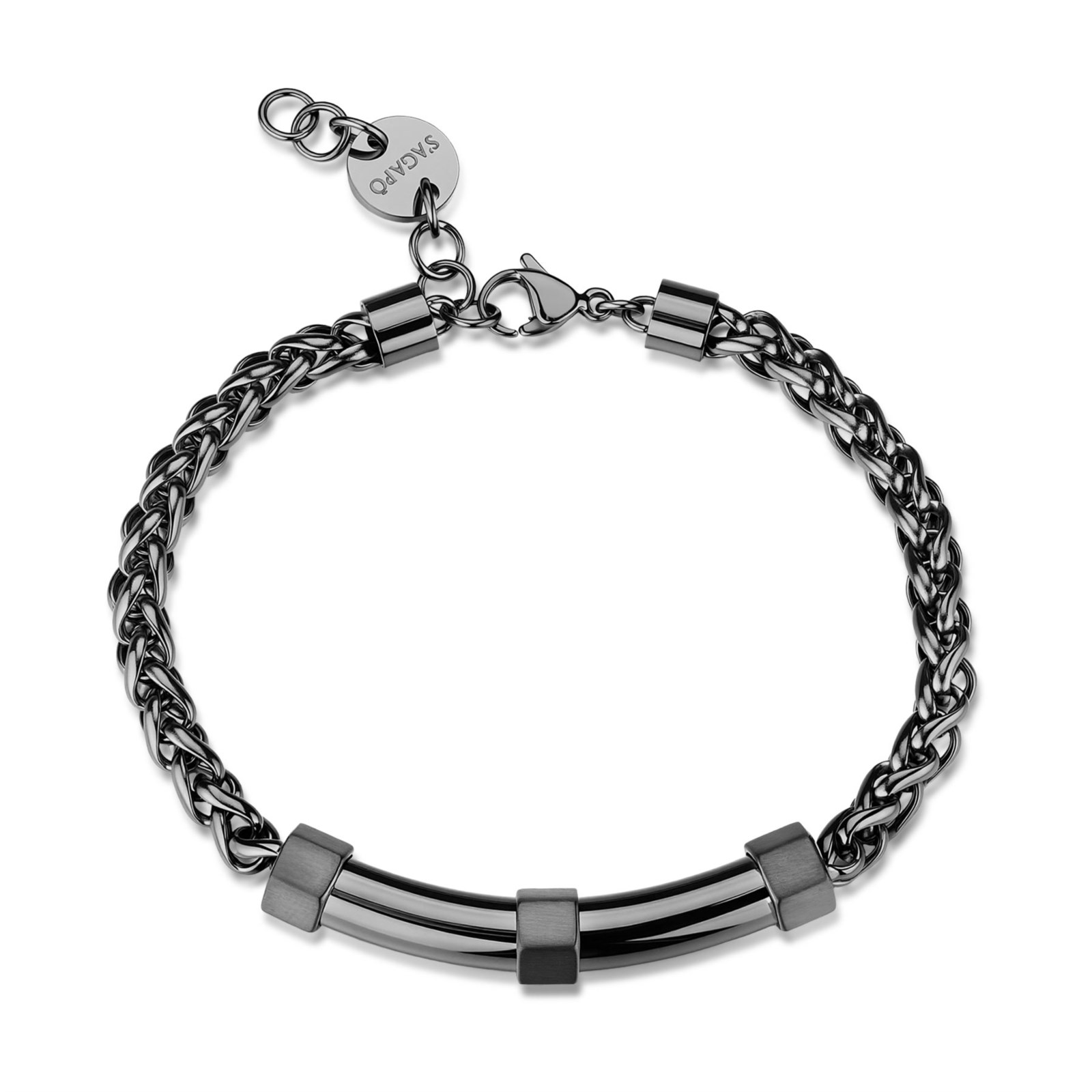 Bracciale uomo sagapò, SBD15, collezione bound, in acciaio 316L con catena, finitura pvd colore rutenio e centrale con dettagli satinati.