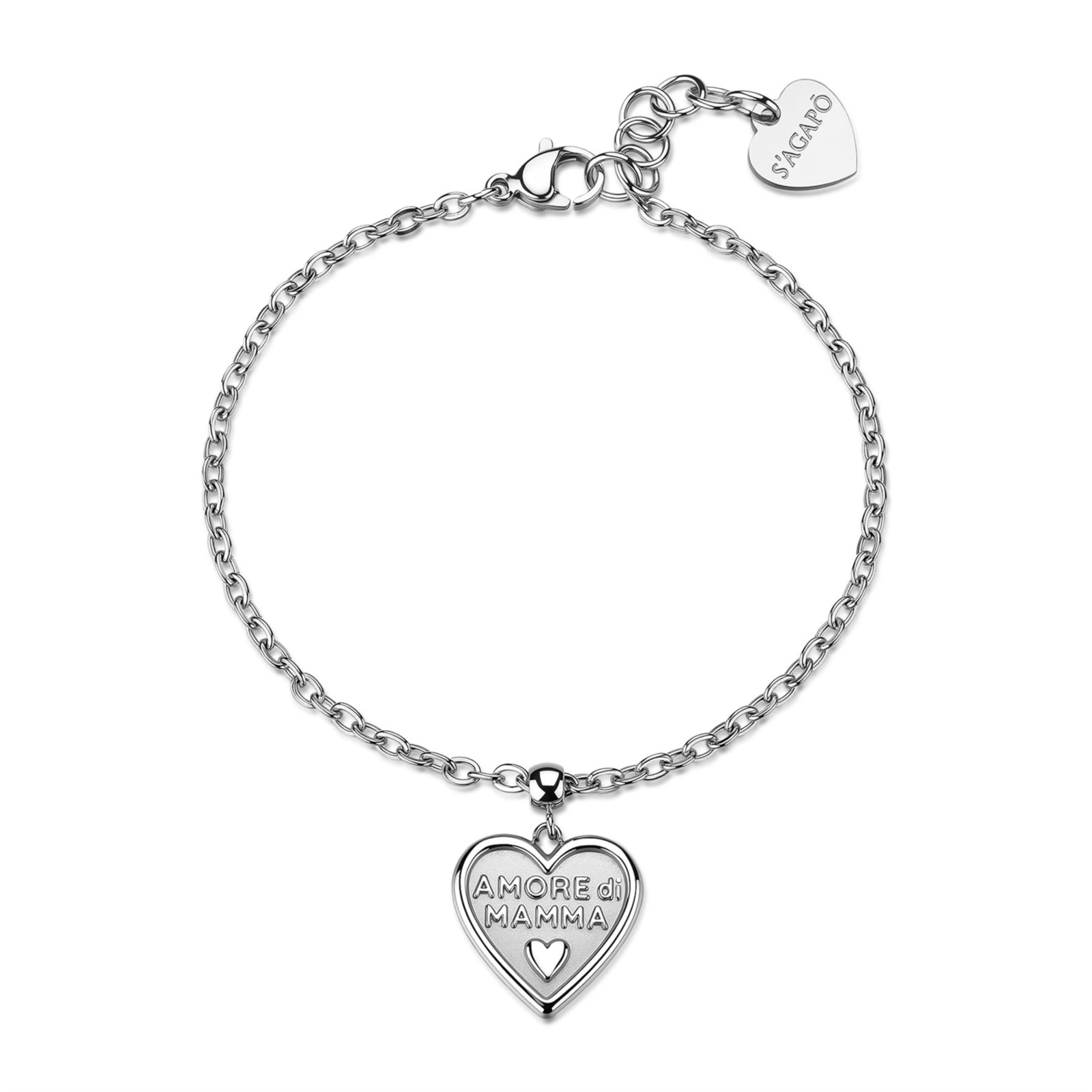 Bracciale donna sagapò, SUH16, collezione duh duh, in acciaio 316L con pendente a cuore satinato, scritta "Amore di mamma" e cuore.