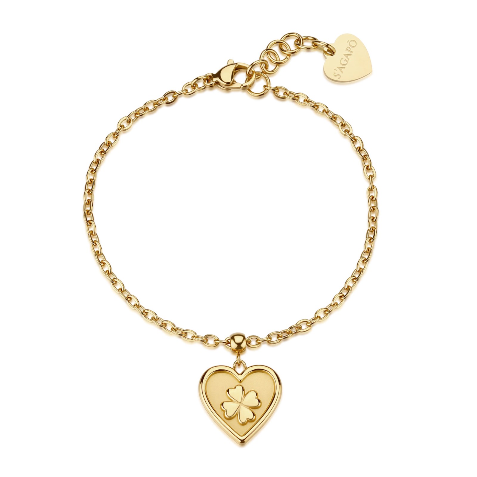 Bracciale donna sagapò, SUH19, collezione duh duh, in acciaio 316L e finitura pvd oro 14K con pendente a cuore satinato e quadrifoglio.