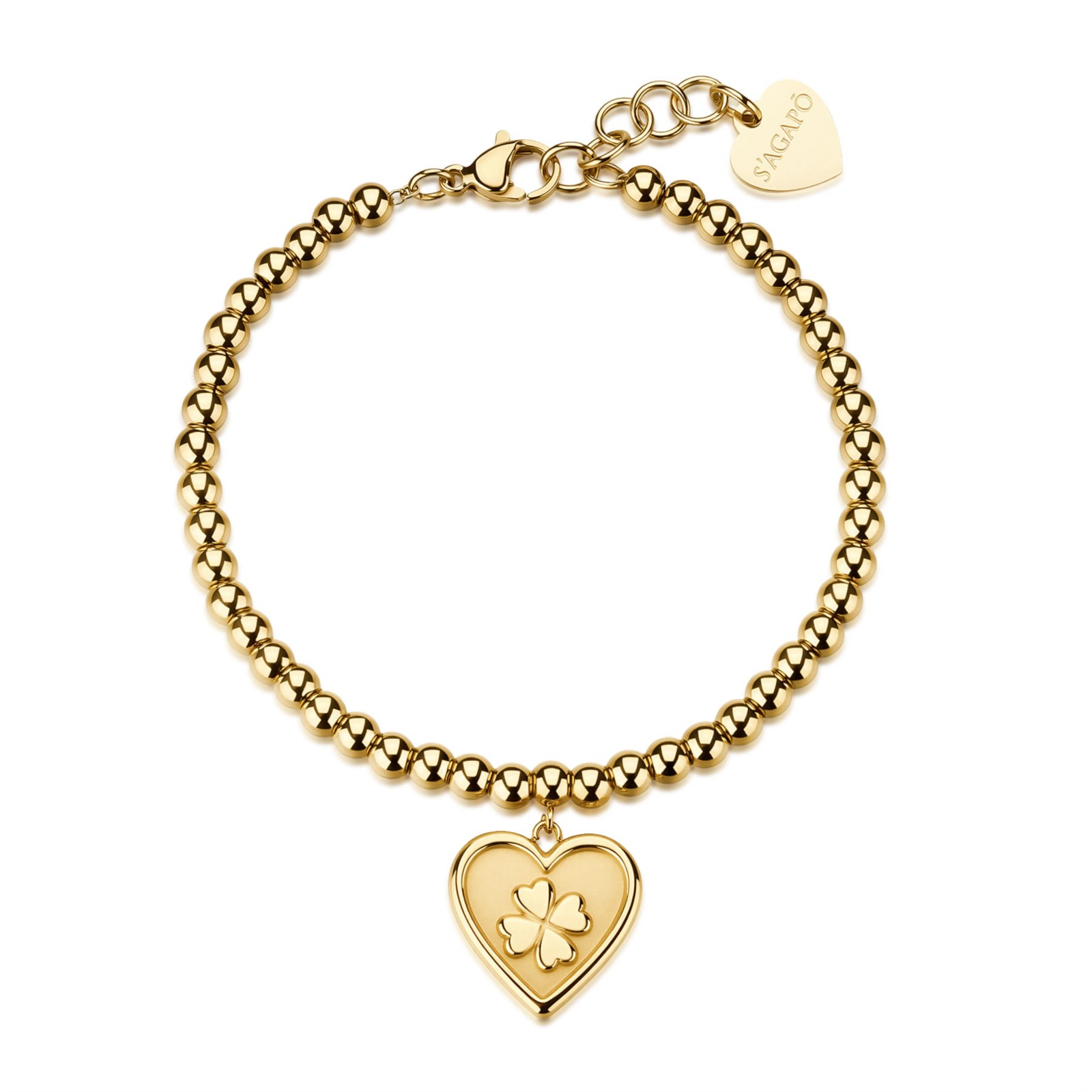 Bracciale donna sagapò, SUH26, collezione duh duh, con sfere in acciaio 316L, finitura pvd oro 14K con pendente a cuore satinato e quadrifoglio.