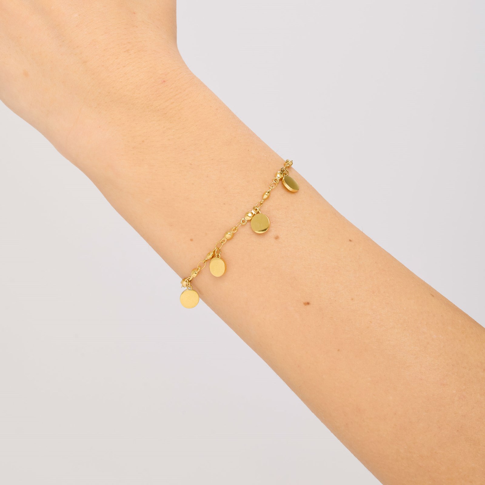 Bracciale donna sagapò, SUM14, collezione elysium, in acciaio 316L e finitura pvd oro 14K con pendenti a forma di cerchio. lunghezza 18, 5cm
