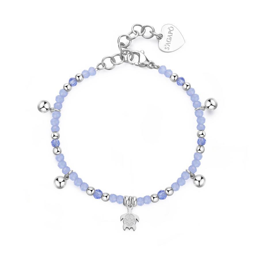 Bracciale donna s'agapo, SGI13, collezione glint, in acciaio 316L con sfere in vetro blu, pendenti a sfera e pendente centrale a forma di tartaruga, lunghezza 18, 5cm