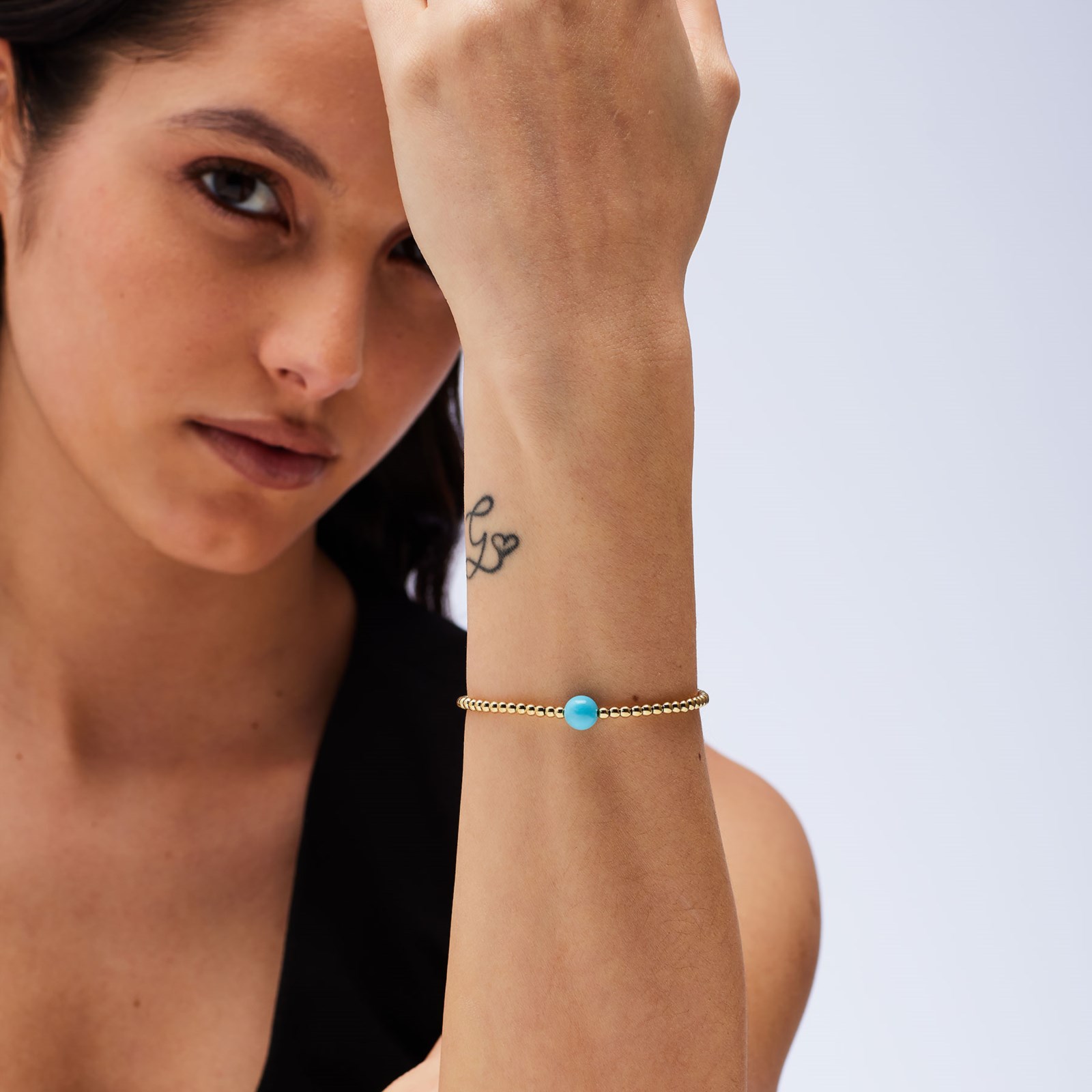 Bracciale donna s'agapo, SGI31, collezione glint, in acciaio 316L e finitura pvd oro 14K con sfere in acciaio e sfera centrale turchese ricostruito, misura 18, 5cm