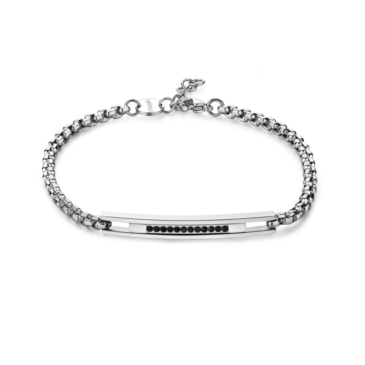 Bracciale uomo s'agapo, SPD17, collezione proud, in acciaio 316L con catena rolò quadrata e centrale con cristalli neri, lunghezza 22cm