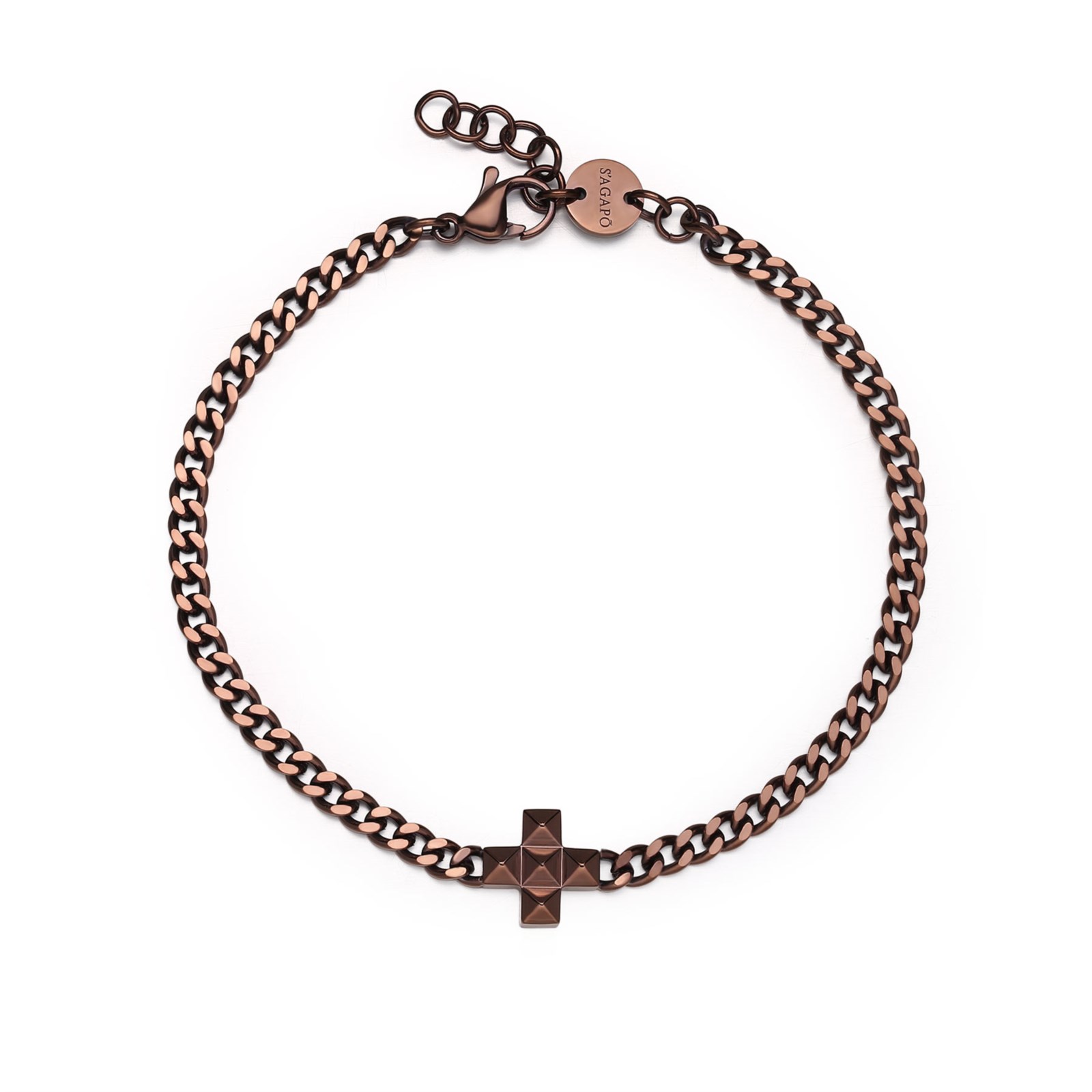 Bracciale uomo sagapò, SPD34, collezione proud, in acciaio 316L e finitura pvd marrone con centrale a forma di croce. lunghezza 21cm.