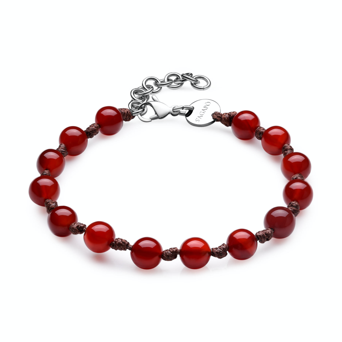 Bracciale uomo sagapò, SRT19, collezione riot, in acciaio 316L con cordino cerato marrone e sfere in agata rossa.