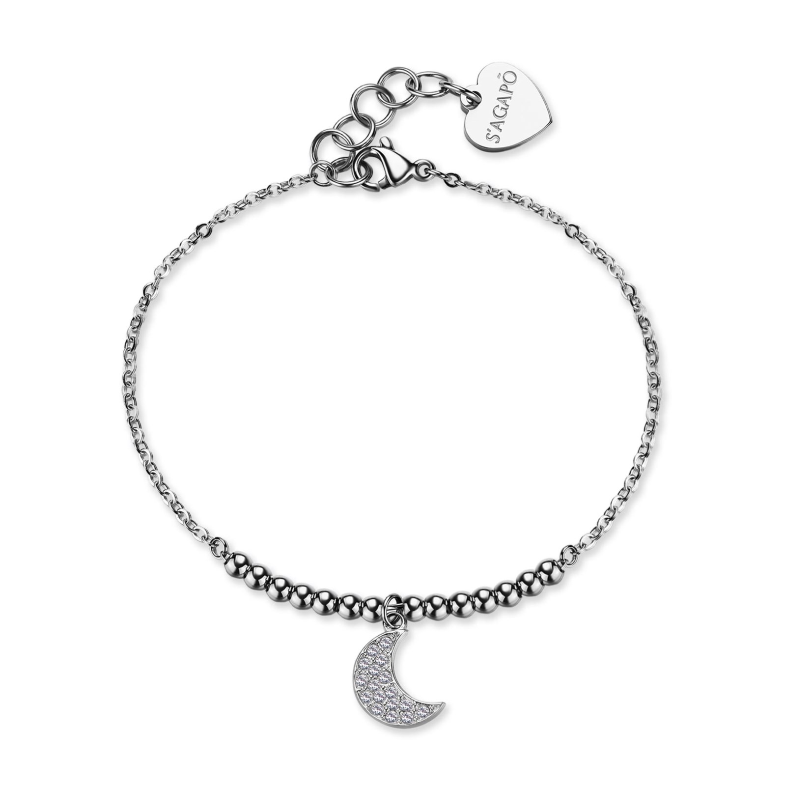 Bracciale donna sagapò, SWH22, collezione witch, in acciaio 316L con pendente a forma di luna e cristalli. lunghezza 23cm