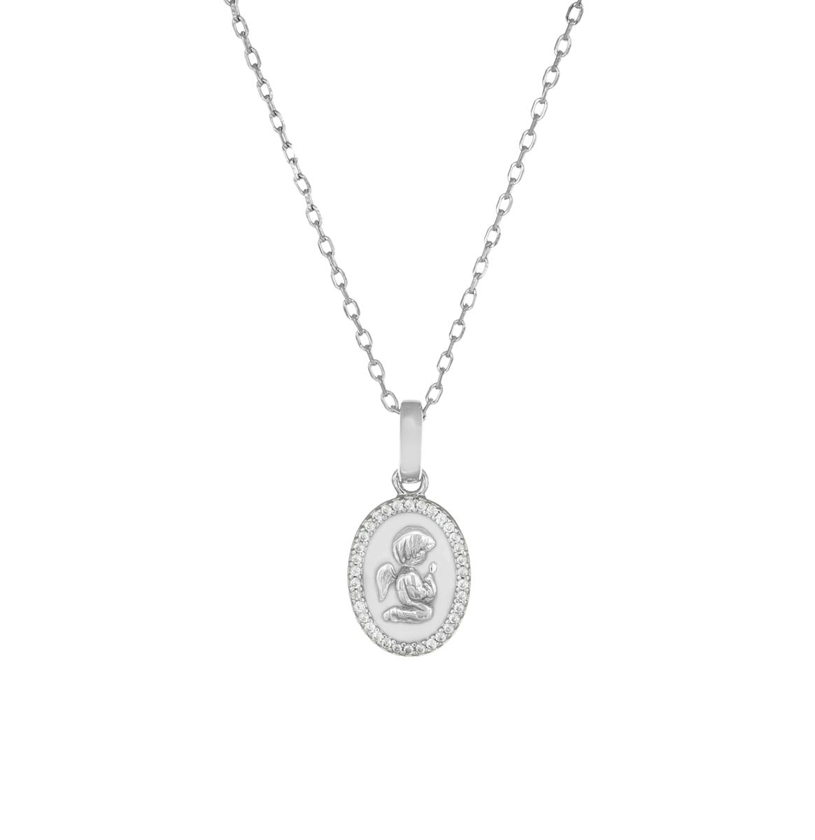 Collana donna amen, CLANSMBB, collezione angelo custode, in argento 925 rodiato con smalto bianco e zirconi, misura 40cm+3cm