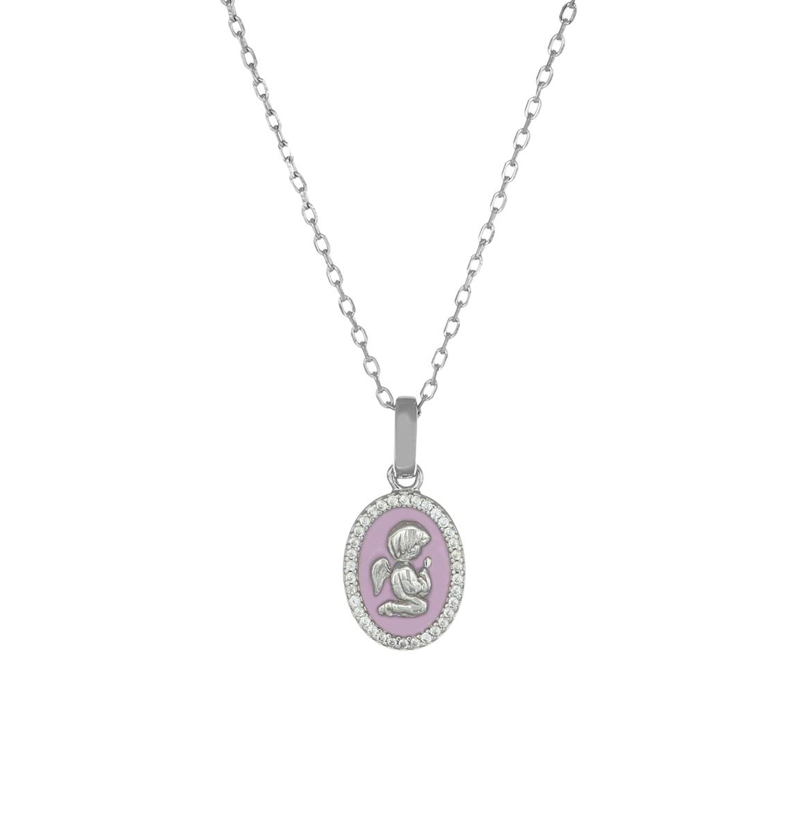 Collana donna amen, CLANSMBRO, collezione angelo custode, in argento 925 rodiato con smalto rosa e zirconi, misura 40cm+3cm