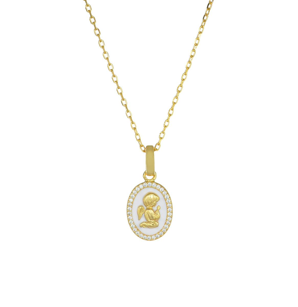 Collana donna amen, CLANSMGB, collezione angelo custode, in argento 925 dorato con smalto bianco e zirconi, misura 40cm+3cm
