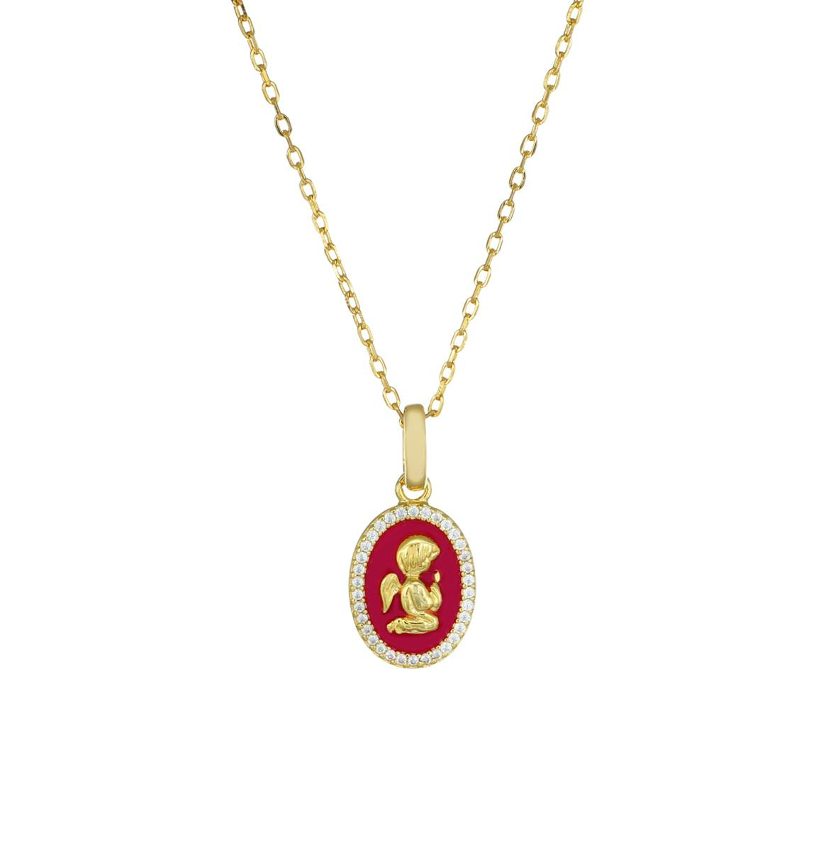 Collana donna amen, CLANSMGBO, collezione angelo custode, in argento 925 dorato con smalto bordeaux e zirconi, misura 40cm+3cm