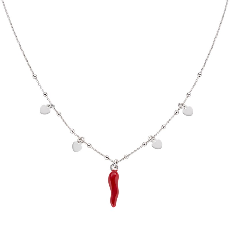Collana donna amen, CLCSHBR, collezione cornetti, in argento 925 rodiato con smalto rosso, lunghezza 40cm+5cm