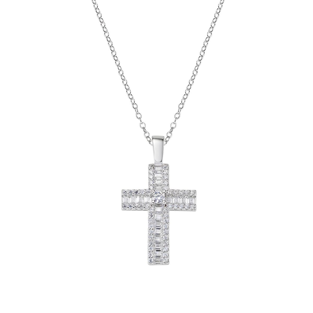 La croce è lunga 2 cm ed è formata da zirconi taglio baguette contornati da un pavé di zirconi bianchi.