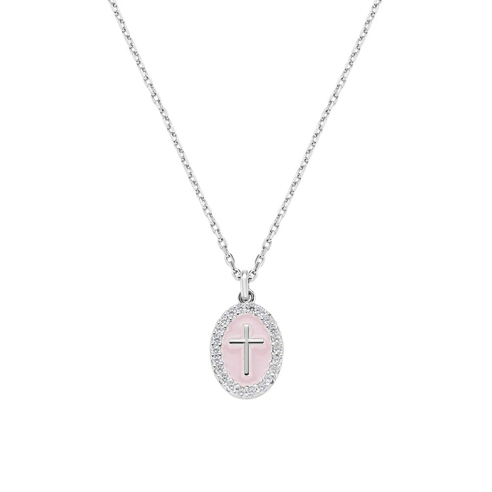 Collana donna amen, OTCLCRSMBRO, collezione croci, in ottone rodiato con medaglia ovale con croce su sfondo smaltato rosa e bordo di zirconi bianchi. Lunghezza del pendente: 1, 5 cm. Catena regolabile da 40 a 45 cm con allungo e chiusura a moschettone