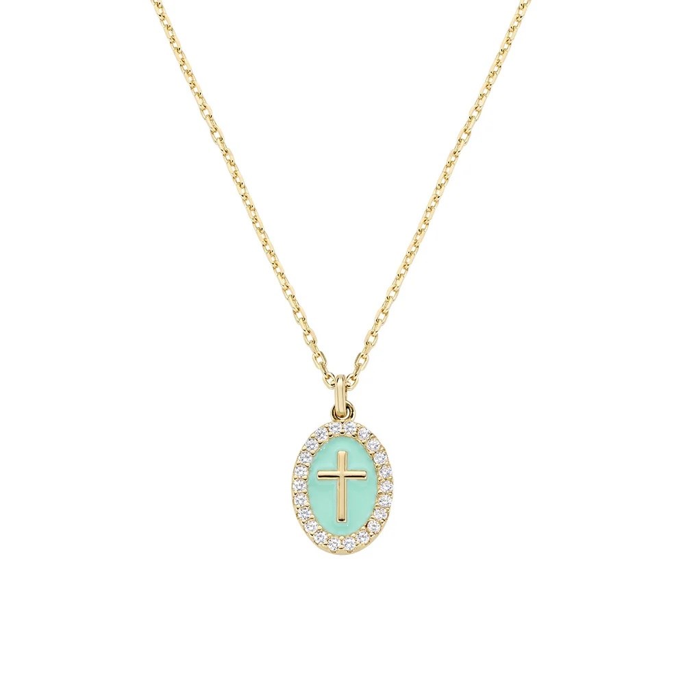 Collana donna amen, OTCLCRSMGTI, collezione croci, in ottone placcato oro 18kt con medaglia ovale con croce su sfondo smaltato verde mare e bordo di zirconi bianchi. Lunghezza del pendente: 1, 5 cm. Catena regolabile da 40 a 45 cm con allungo e chiusura a moschettone