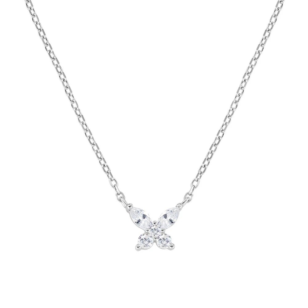 Collana donna amen, CLBUTBBB, collezione fiori, in argento 925 rodiato con charm farfalla di 7 mm formato da due zirconi taglio navette e tre in taglio brillante. Lunghezza regolabile da 40 a 45 cm con allungo e moschettone