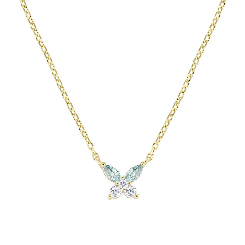 Collana donna amen, CLBUTGBBLB, collezione fiori, in argento 925 dorato con charm farfalla di 7 mm formato da due zirconi london blue taglio navette e tre in taglio brillante. Lunghezza regolabile da 40 a 45 cm con allungo e moschettone