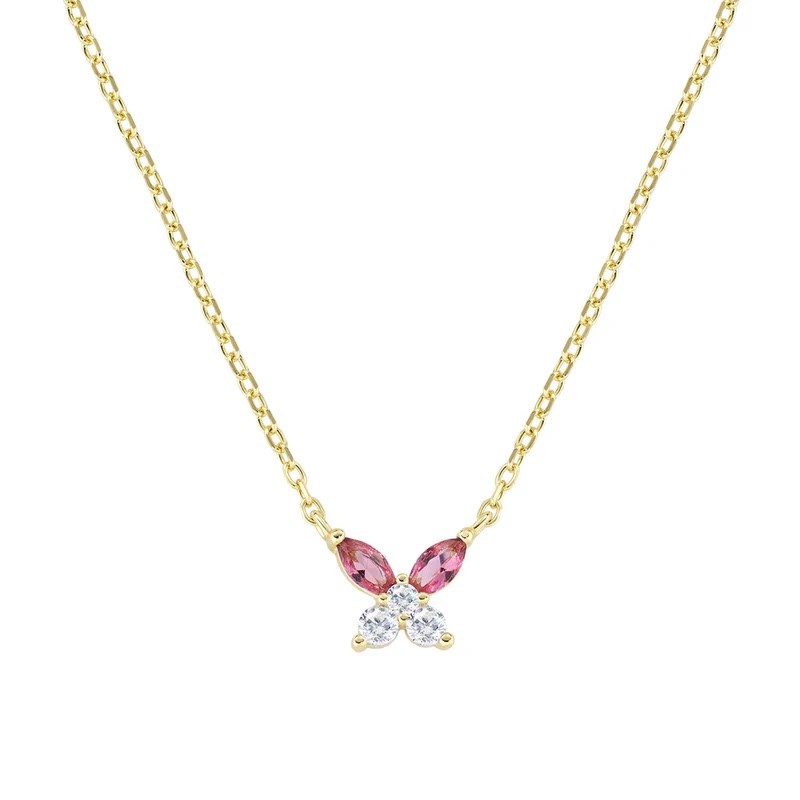 Collana donna amen, CLBUTGBCI, collezione fiori, in argento 925 dorato con charm farfalla di 7 mm formato da due zirconi rosso ciliegia taglio navette e tre in taglio brillante. Lunghezza regolabile da 40 a 45 cm con allungo e moschettone
