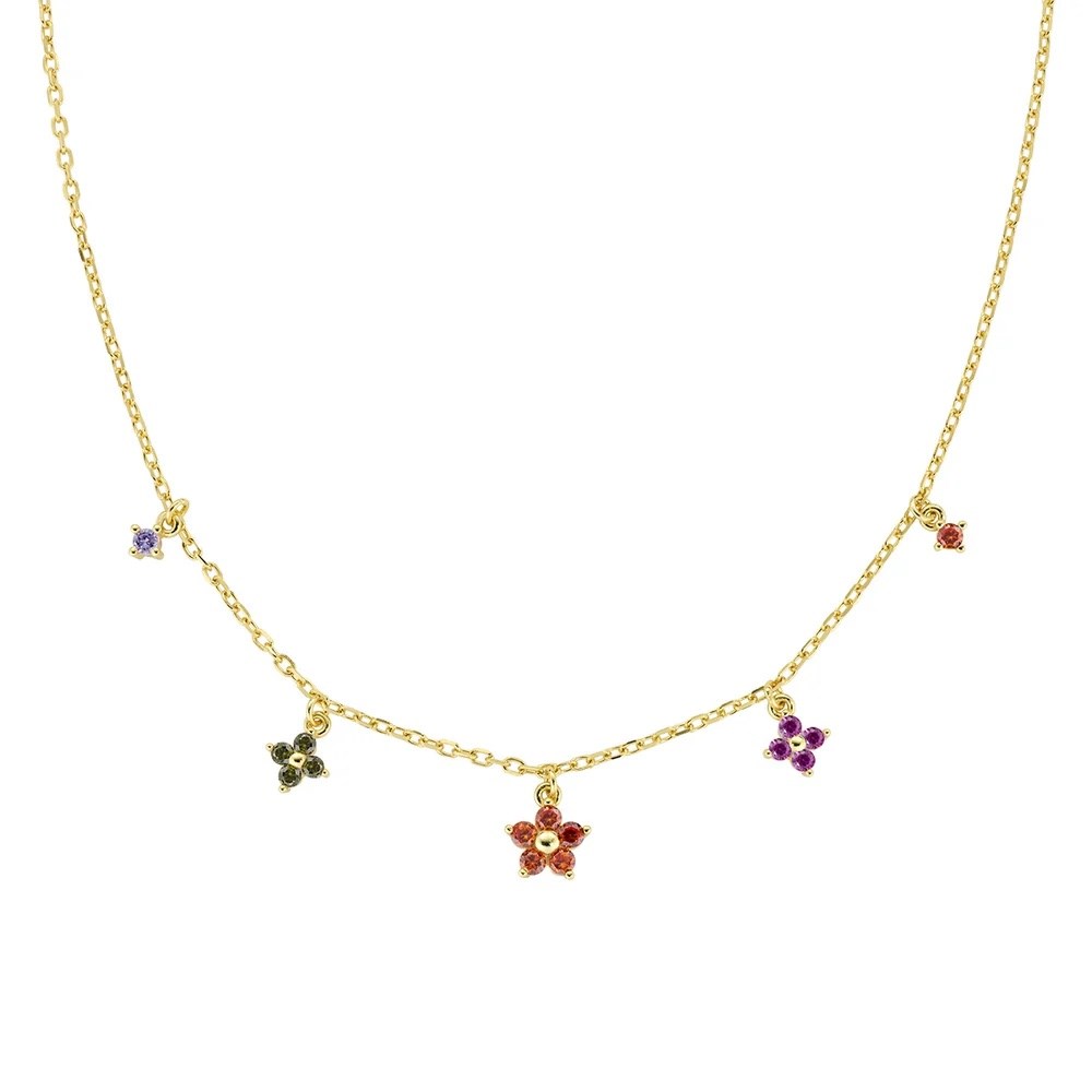 Collana donna amen, CLFIMGAR1, collezione fiori, in argento 925 dorato con fiorellini pendenti di zirconi multicolor. Il fiore centrale a cinque petali è arancione, accompagnato da un bocciolo a quattro petali verde e uno fucsia. Lunghezza regolabile da 40 a 45 cm con allungo e chiusura a moschettone.