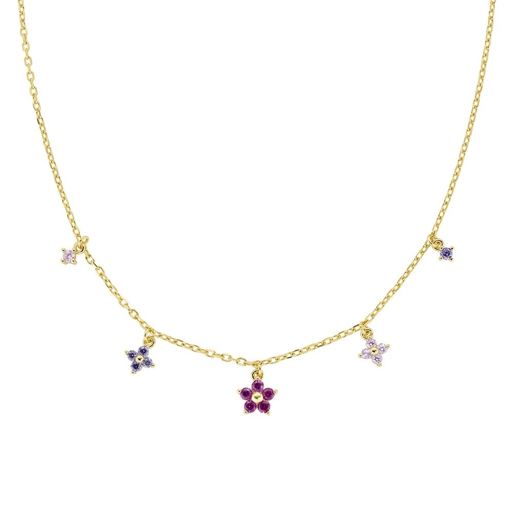 Collana donna amen, CLFIMGFU1, collezione fiori, in argento 925 dorato con fiorellini pendenti di zirconi multicolor. Il fiore centrale a cinque petali è fucsia, accompagnato da un bocciolo a quattro petali rosa e uno lilla. Lunghezza regolabile da 40 a 45 cm con allungo e chiusura a moschettone