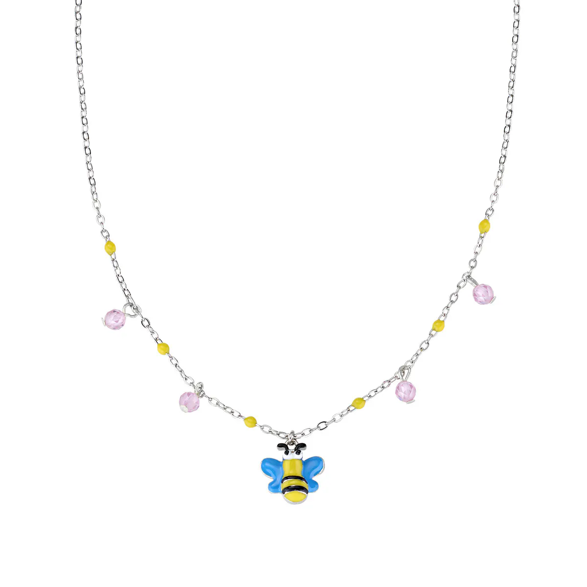 Collana unisex amen, JCLBEB, collezione junior, in argento 925 rodiato con pendente a forma di ape e smalto giallo, nero e azzurro, e cristalli rosa sfaccettati.