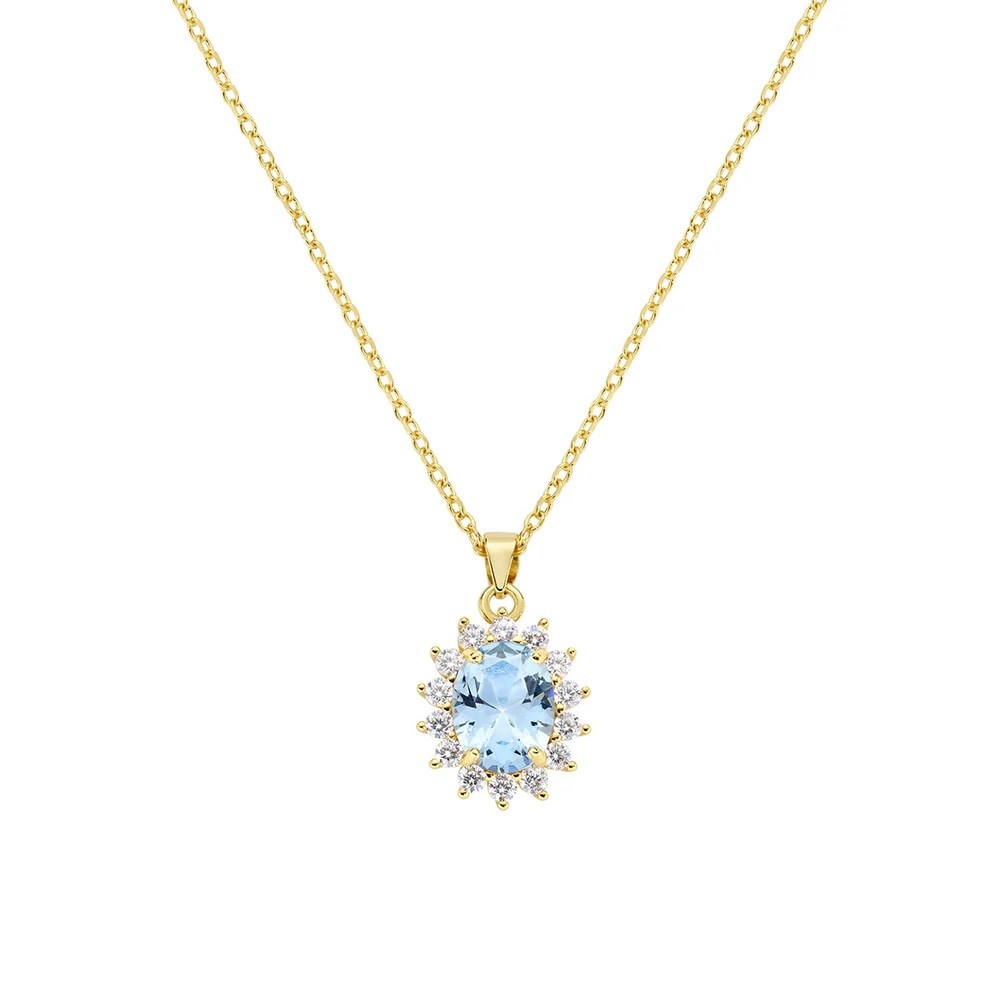 Collana donna amen, CLLDGGBAC, collezione lady, in argento 925 dorato con pendente con zircone acquamarina centrale taglio ovale e corona di zirconi bianchi. La lunghezza della catena è regolabile da 40 a 45 cm con allungo e chiusura a moschettone, il pendente è 1, 4 cm e la pietra centrale 8 mm