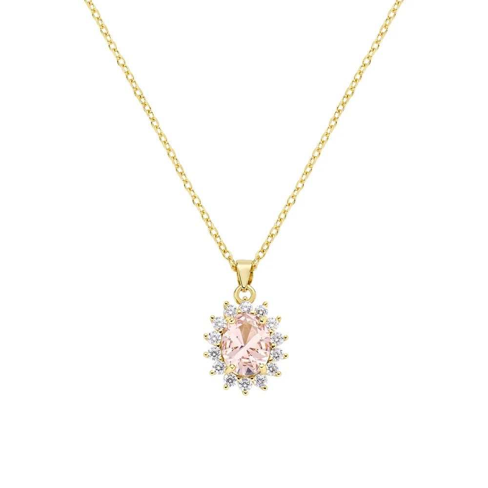 Collana donna amen, CLLDGGBMO, collezione lady, in argento 925 dorato con pendente con zircone morganite centrale taglio ovale e corona di zirconi bianchi. La lunghezza della catena è regolabile da 40 a 45 cm con allungo e chiusura a moschettone, il pendente è 1, 4 cm e la pietra centrale 8 mm