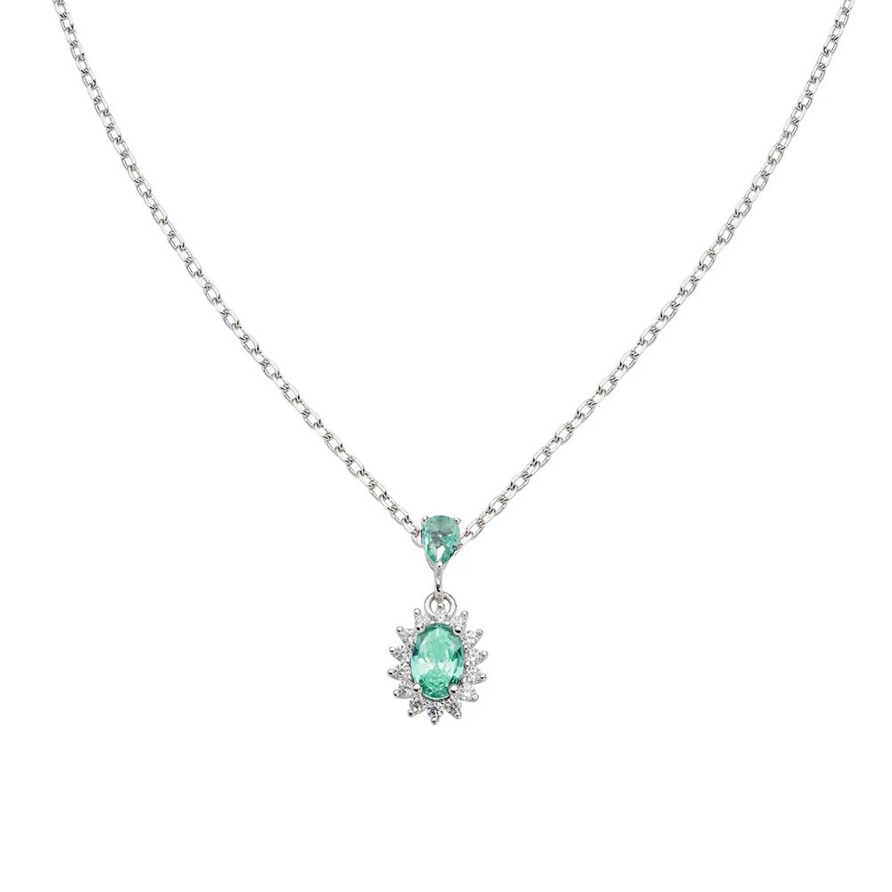 Collana donna amen, CLLDPBBVA1, collezione lady, in argento 925 rodiato, pendente a cestello con zircone rosso verde mare taglio ovale 6 x 4 mm e corona di zirconi bianchi, sormontato da zircone verde mare a goccia.