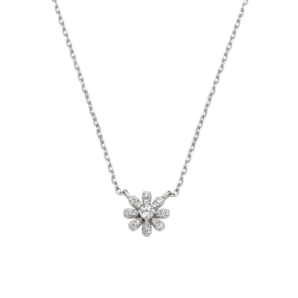 Collana donna amen, CLFIPBBZ3, collezione lady fiori, in argento 925 rodiato con piccolo charm a forma di margherita da 8 mm, zircone centrale e petali in pavé di zirconi bianchi.