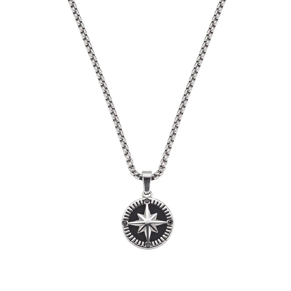 Collana uomo amen, ACCL1010, collezione metropolitan, in Acciaio con Rosa Dei Venti e Zirconi Neri. lunghezza 50+5 cm